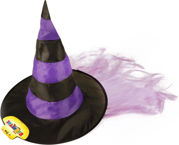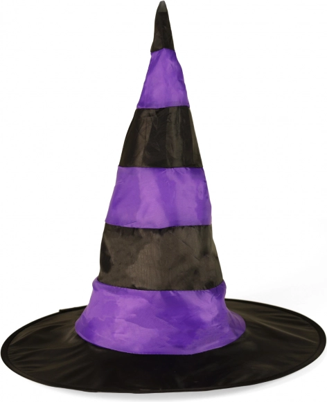 A kalap kiemelkedik ikonikus boszorkány megjelenésével, amely széles karimát és csíkos mintát tartalmaz.