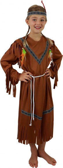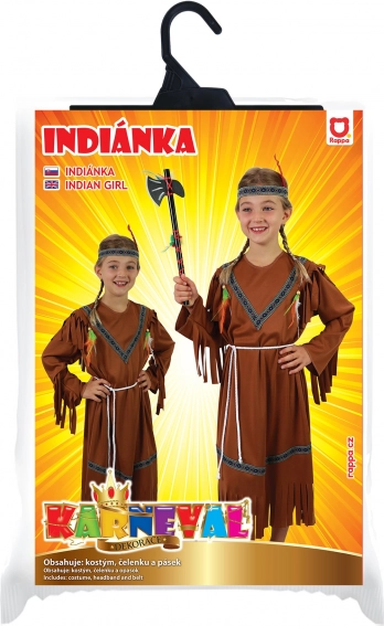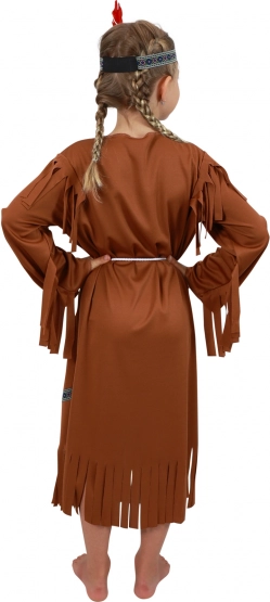 Bájos indián lány farsangi jelmez 4–6 éves (105–116 cm) kislányoknak. Barna ruha indián mintákkal, rojtokkal és hozzáillő fejdísszel, tollal az autentikus megjelenésért bálokra, iskolai műsorokra és gyerekjátékokhoz. Tartozék egy zsinóröv is. A balta nem része a csomagnak.