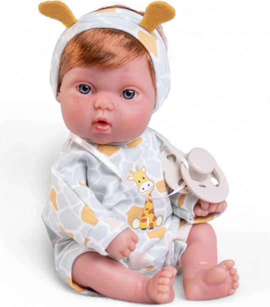 A baba aranyos zsiráfruhába van öltöztetve, fejpánttal, amit kis sárga fülek és cumi egészítenek ki, ezáltal növelve a realista megjelenését.