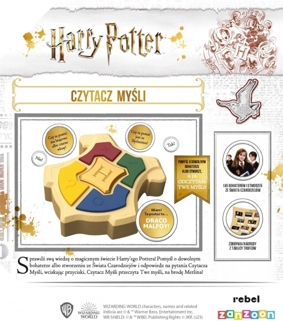 Igazi csemege minden Harry Potter-rajongónak, akik szeretnék letesztelni a kedvenc történetükkel kapcsolatos tudásukat, és egy kis varázslatot is megtapasztalni! Gondolj bármelyik szereplőre vagy lényre a kis varázsló világából, és hagyd, hogy a gondolatolvasó kitalálja, kire gondoltál! Ez a varázslatos eszköz néhány kérdést tesz fel, amelyekre konkrét gombok megnyomásával válaszolsz. Így közösen meghatározzátok, melyik szereplőről van szó.