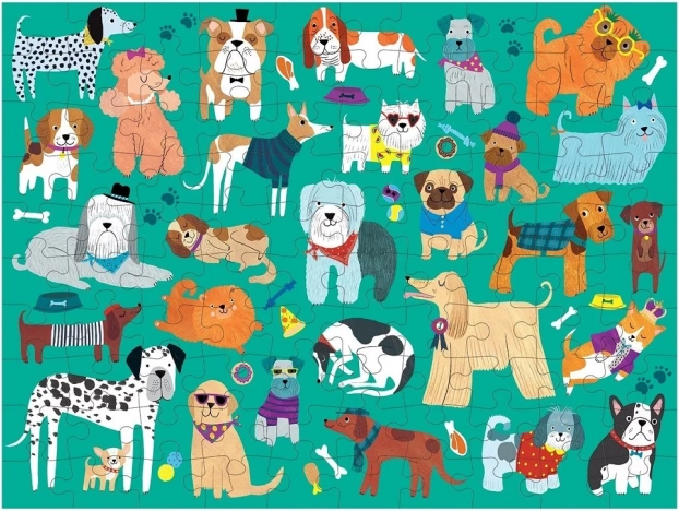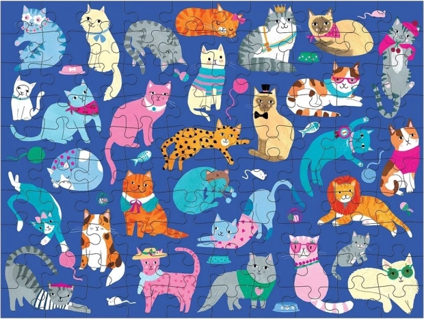 Ez a kétoldalas puzzle dupla élményt nyújt: az egyik oldalon kedves kutyás illusztrációk, a másikon gyönyörű macskák. A 100 darabnak köszönhetően ideális 6 éves kortól, valamint közös családi kirakózáshoz. A minőségi kidolgozás és az élénk színek támogatják a koncentrációt és edzik a vizuális memóriát.