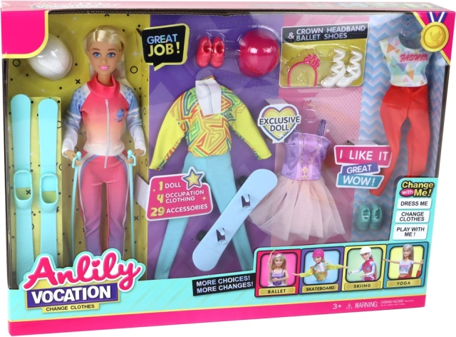 A sportos Anlily baba nagyszerű játszótárs, amely rengeteg kreatív szórakozást nyújt a gyerekeknek. Ez a bájos baba kék szemű, hosszú szőke, fésülhető hajjal rendelkezik, méretei: 30 cm x 4 cm x 6 cm. A csomag számos ruhát és kiegészítőt tartalmaz, amelyek lehetővé teszik a gyerekeknek különféle szerepek eljátszását és különböző sportok megismerését.