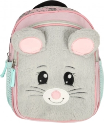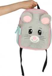 A hátizsák elülső része puha műszőrrel borított, hímzett egérke-arccal – olyan, mint egy kedvenc plüssjáték, amit a gyerekek azonnal megszeretnek.