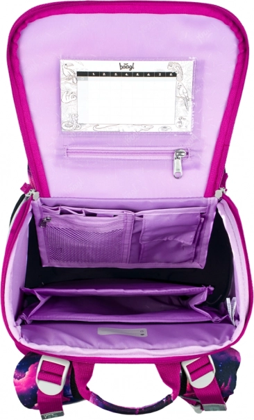 Felnyitható nyitórendszer, belső rendező gumipánttal, átlátszó zseb órarendnek és oldalzsebek kulacsnak a tökéletes rendért.