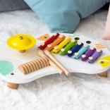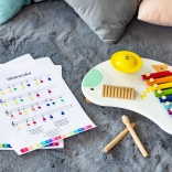 Színes, 8 hangú xilofon, csengő hangú cintányér és fa kaparó (guiro) kínál változatos hangskálát az első zenéléshez és ritmusjátékokhoz.