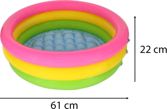 Szerezzen örömet a gyerekeknek ezzel a medencével, amelyet kifejezetten a forró napokra terveztek. A kompakt, 61 × 22 cm-es méret, a három külön-külön felfújható gyűrű szivárványszínekben és a felfújható alj a nagyobb kényelemért tökéletes választássá teszi a legkisebbek számára.
