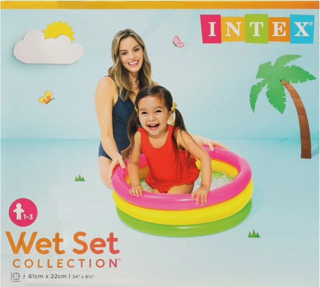 A színes INTEX gyerekmedence 61 cm átmérővel ideális az első vizes élményekhez otthon és a kertben. Három feltűnő gyűrű és az erősített puha felfújható alj gondoskodik a kényelemről és a biztonságról, míg az élénk színek játékra csábítanak. Könnyű és helytakarékos, tartós PVC-ből, 1–3 éves gyermekeknek.