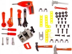 Készlet több mint 50 darabot tartalmaz: akkumulátoros fúró, satu, fűrész, kalapács, fejsze, fogó, gumis kalapács, csavarhúzó, kulcs és egyéb kiegészítők mint csavarok, anyák, csatlakozók és kampók.<;/p><;/div>