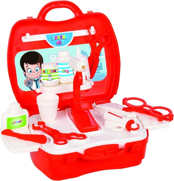 Válj kis orvossá ezzel az orvosi készlettel egy hordozható, piros bőröndben. Sok elemet és kiegészítőt tartalmaz a kreatív orvosos játékhoz, praktikus, zárható csomagolásban.