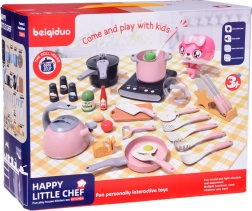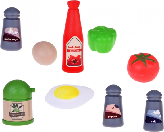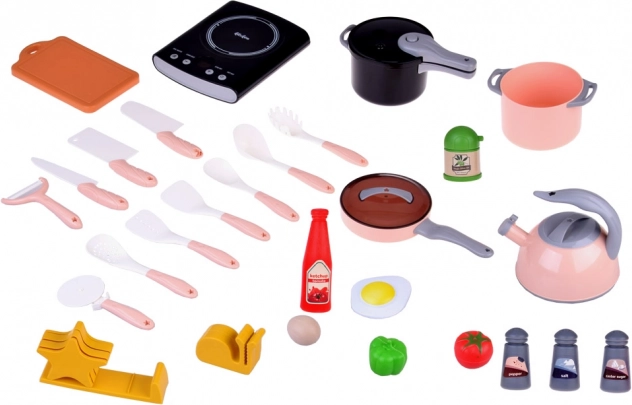 A szett mindent tartalmaz, amire egy kis szakácsnak szüksége lehet: főzőlap, edények, konyhai eszközök, sőt még élelmiszerek és fűszerek is.