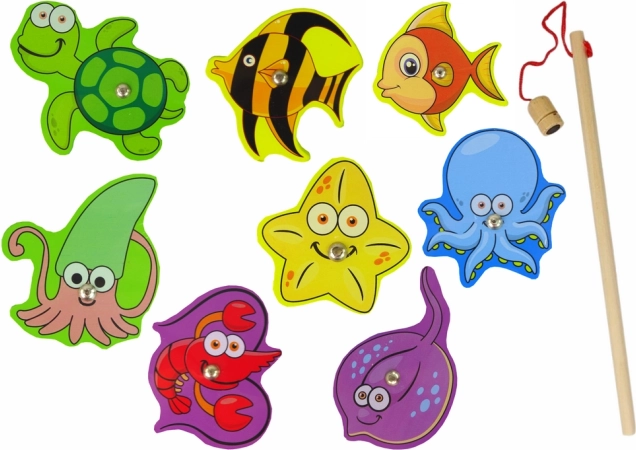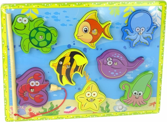 A fa tengeri állatok vadász szett gyönyörűen illusztrált táblával van ellátva, amely tengerfeneket ábrázol, és lenyűgöző betekintést nyújt a gyermekeknek a víz alatti világba. A különféle fa állatfigurák szórakoztató módon elhelyezhetők és beépített mágnesek segítségével fából készült bottal foghatók meg.