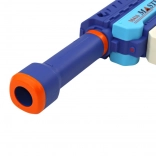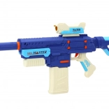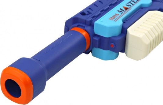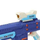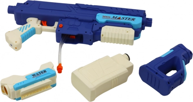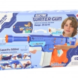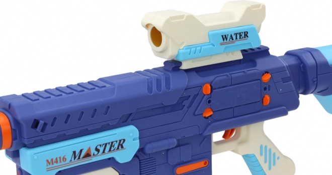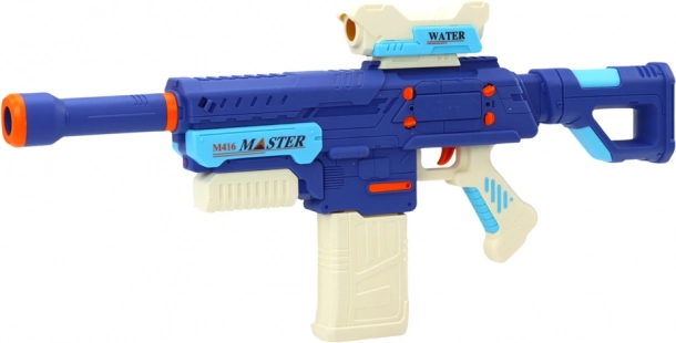 .M416 újratölthető vízipisztoly! Ez a futurisztikus puska a kék és fehér árnyalataiban, narancssárga részletekkel lenyűgöző dizájnnal, tökéletes társ a nyári kalandokhoz gyermekeknek és felnőtteknek egyaránt.