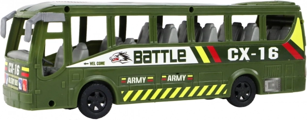 Masszív zöld busz/szállítójármű katonai feliratokkal, amely bővíti a földi játék lehetőségeit. Ideális egységek és felszerelés szállítására.