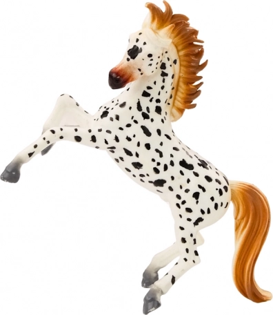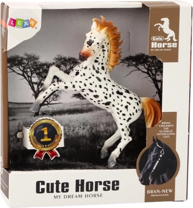 Ez a gondosan megmunkált lófigura realista részleteivel tűnik ki – fehér alapszín stílusos pöttyökkel, barna sörény és farok, valamint karakteres póz, amelyben a ló két lábon áll. Mozgás érzetét kelti, és minden gyerekfarmnak vagy istállónak autentikus hangulatot ad.