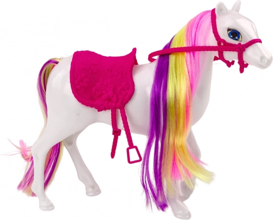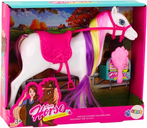 Fedezze fel a lovaglás varázsát ezzel a fehér lófigurával, amely részletgazdag kivitelével és kiegészítőivel nyűgöz le. A gyerekek kreatív frizurákat készíthetnek a mellékelt kefével, és kiegészíthetik a játékot az állítható rózsaszín nyereggel és a kantárral. A játék kiváló a finommotorika, a képzelőerő és a gondoskodó készségek fejlesztésére.
