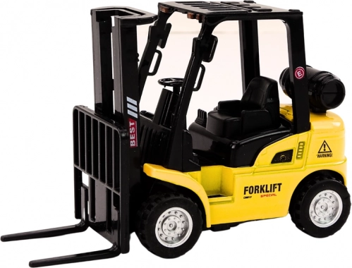 Fém homlokvillás targonca feltűnő sárga színben, amely élethű játékélményt kínál elemek nélkül a súrlódásos meghajtásnak köszönhetően. A állítható villák lehetővé teszik a teher emelését és leengedését, a tartós fém szerkezet pedig hosszú élettartamot és biztonságos szórakozást garantál 3 éves kortól.