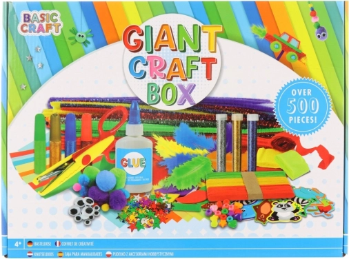 A nagy kreatív készlet gyöngyöket, mozgó szemeket, színes csillagokat, színes krepppapírt, ragasztót, csillámos színes ragasztókat, csillámokat, textilből készült bolyhos golyókat, hullámos mintájú ollót, színes tollakat, színes pálcikákat és bolyhos színes drótokat tartalmaz. A csomag összesen több mint 500 darabot tartalmaz. Dobozban csomagolva. A csomag mérete kb. 40×30×5 cm. Ajánlott életkor: 4+