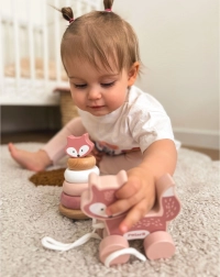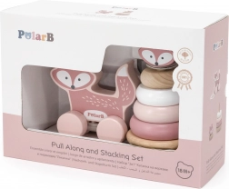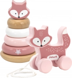 A készletben két kedvelt játékot találsz: a rókás rakosgató tornyot, amely méret és szín szerint tanítja a karikák egymásra helyezését, valamint a zsinóron húzható rókát, amely motivál a járásra és a vidám mozgásra. A kettő együtt a játékos, természetes tanulást támogatja.