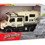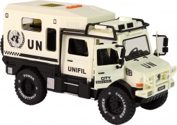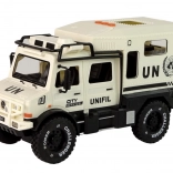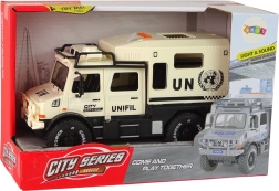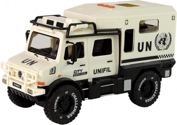 Ez a masszív terepjáró elegáns bézs színben rengeteg akciót és szórakozást kínál. A tetőn található három gomb egyikének megnyomására felkapcsolódnak az első LED fények, és megszólalnak a szirénahangok, fokozva a játék valósághű élményét. A nyitható ajtók ösztönzik a kreatív történetmesélést és fejlesztik a gyerekek fantáziáját.