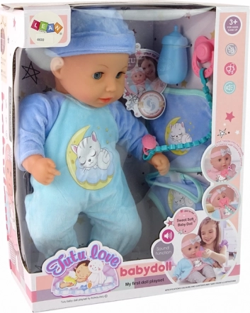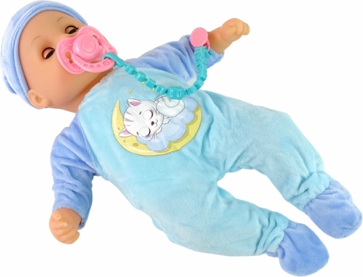Az aranyos baba szép kék, alvó macska mintás pizsamában van öltöztetve, és egy sapka van a fején. A szett része továbbá egy rózsaszín cumi és egy itatós üveg. A kiegészítők között szerepel egy előke és alsónemű is. Az összhatás harmonikus és rendkívül bájos.