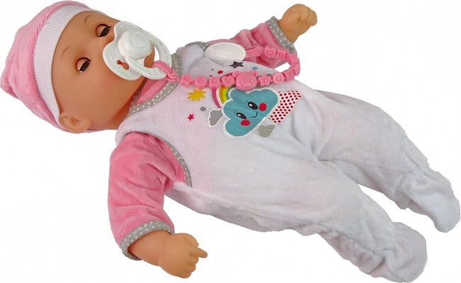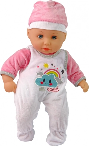 A baba rózsaszín-fehér pizsamát visel mosolygós felhővel és hozzáillő sapkával, ami vonzó és édes megjelenést kölcsönöz a játéknak.