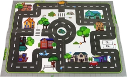 A térkép és a közlekedési jelzések helyet adnak a gyerekek kreatív játékához és a közlekedési szabályok tanulásához.