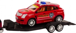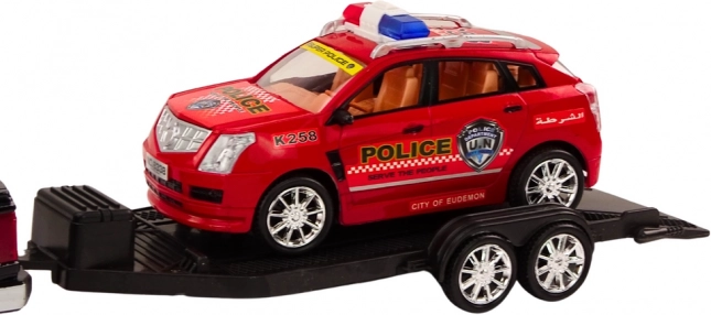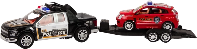 Akciódús rendőrségi készlet fekete pickuppal, szállító trélerrel és piros terepjáróval, 3 éves kortól. A lendkerekes meghajtásnak, a levehető utánfutónak és a valósághű POLICE részleteknek köszönhetően órákig tartó szórakozást nyújt. Minőségi kivitel műanyagból és fém elemekből. Tanúsítvány: CE és EN71.