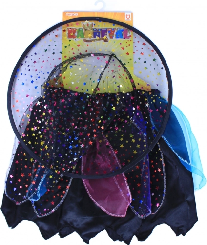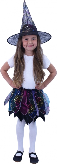 A jelmez gyermeki fantáziával készült. A színes szoknya kalappal együtt ellenállhatatlan megjelenést kölcsönöz, melyet minden kis boszorkány értékelni fog.