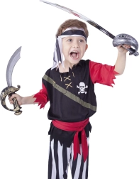Farsangi jelmez igazi kis kalózoknak! Az M méretű jelmez 6–8 éves (116–128 cm) fiúk számára készült. Figyelem, a csomag övet, felsőrészt, nadrágot és kendőt tartalmaz! Nemcsak idén kell EKO-nomikusan és EKO-logikusan gondolkodni! Az EKO-csomagolás különösen webáruházak számára előnyös, ahol a vásárló a fotó alapján választ, és nincs szükség nagy, vállfás csomagolásra. EKO-logikusan – a csomagoláshoz kevesebb műanyagot és egyéb anyagokat használtunk fel. Kis, átlátszó tasakról van szó fényképpel. EKO-nomikusan – az EKO-csomagolás csak a hely felét foglalja el – spóroljon raktárhelyet velünk!