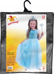 Elbűvölő lány jelmez kis hercegnőknek kék színben, fehér tüllel és csillogó flitteres felsőrésszel. Ideális farsangra, ünnepségekre és mesés szerepjátékhoz. Az M méretű ruha 6–8 éves korig (116–128 cm) finom megjelenésével és kényelmes szabásával hódít. A könnyű anyagoknak köszönhetően kellemes viselet, kiemeli a mesés megjelenést, a csillogó hatást és a viselési kényelmet.