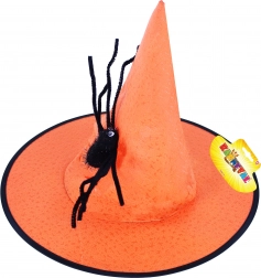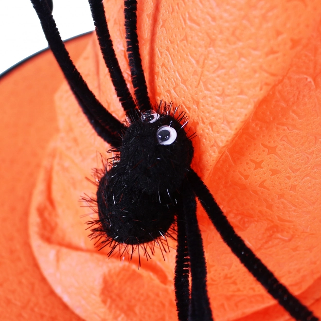 Stílusos narancssárga boszorkánykalap fekete szegéllyel és feltűnő pókkal, tökéletes kiegészítő Halloweenre. Autentikus, látványos megjelenést ad jelmezednek, és remek választás bulikra, tematikus eseményekre és beöltözésekhez.