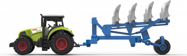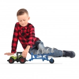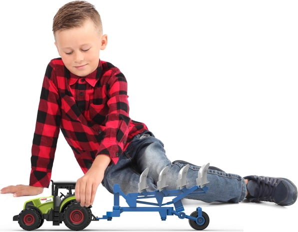 A haladást a lendkerék biztosítja, így a traktor egy könnyű lökéssel könnyen elindul. A szerelvény összhossza 37 cm, ami stabilitást és kényelmes irányítást nyújt a kis gyerekkezeknek. Az elemek a csomagban vannak, így a gyerekek rögtön játszhatnak a kibontás után.