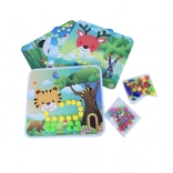 A kreatív mozaik gombostűkkel segíti a gyerekek finommotorikájának, fantáziájának és koncentrációjának fejlesztését. A készlet 5 állatos motívumot, kétféle méretű színes gombostűt és praktikus, lyukacsos alaplapot kínál a képek könnyű kirakásához.