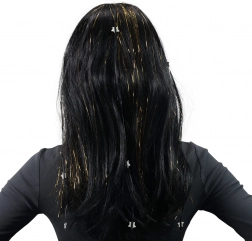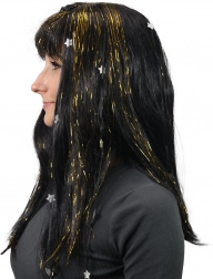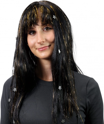 A paróka arany csíkokat és ezüst csillagokat ad a klasszikus fekete hajhoz, ami bármilyen tematikus rendezvény nagyszerű kiegészítőjévé teszi.