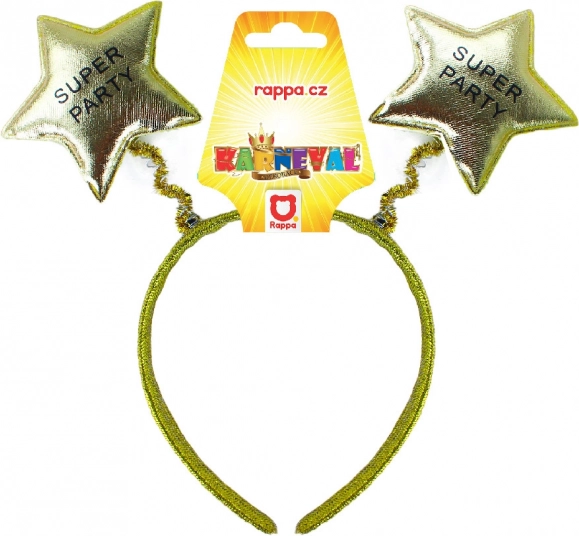 Farsangi fejpánt SUPER PARTY felirattal egy stílusos kiegészítő minden ünnepséghez, amely aranyszínű csillagokkal vonzza a figyelmet.