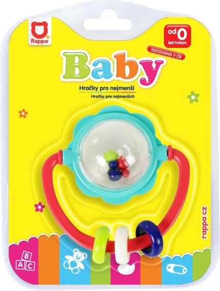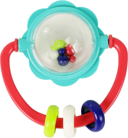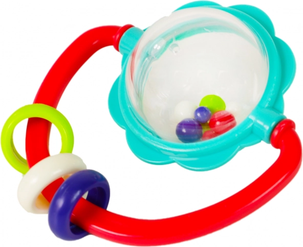 A középen golyócskákkal ellátott, színes, virág alakú babacsörgő ösztönzi a legkisebbeket a világ felfedezésére. Rázásra kellemes hangot ad, amely felkelti a figyelmet és fejleszti a kéz–szem koordinációt.