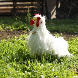 A plüss csirke kézzel varrott és úgy készült, hogy a lehető legvalósághűbben emlékeztessen egy igazi csirkére.