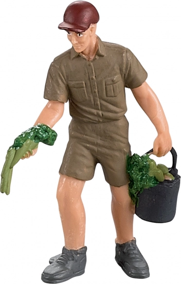 A részletgazdag gazdafigura vödröt és zöldséget tart, hogy etesse az állatokat és gondoskodjon róluk.