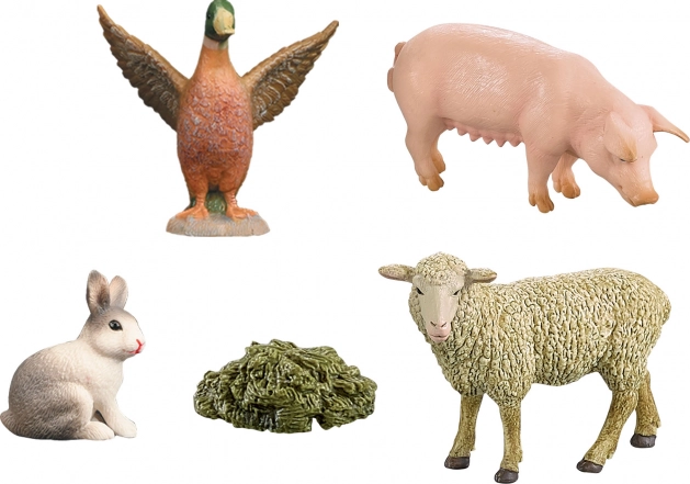 A malacka, a bárányka, a kacsa és a nyúl élethű textúrával és színekkel, jó minőségű, kemény gumiból készültek, a strapabíró, mindennapos játékhoz.