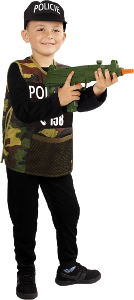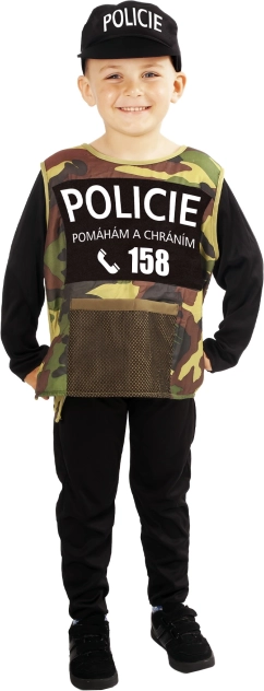 Változtasd a kis hőst a törvény őrévé: gyerek rendőr jelmez 6–8 éves (117–128 cm) méretben tartalmaz fekete overált, terepmintás mellényt POLICIE felirattal és sapkát. A praktikus öko csomagolás kevesebb műanyagot használ és helytakarékos.