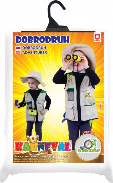 Induljatok felfedező útra a 3–7 éves (104–134 cm) gyerekeknek készült kis kalandor jelmezzel. A szett mellényt és kalapot, valamint praktikus kiegészítőket kínál: távcső, nagyító, síp és iránytű cseh nyomattal – ideális farsangra, jelmezbálra és felfedezős játékhoz.
