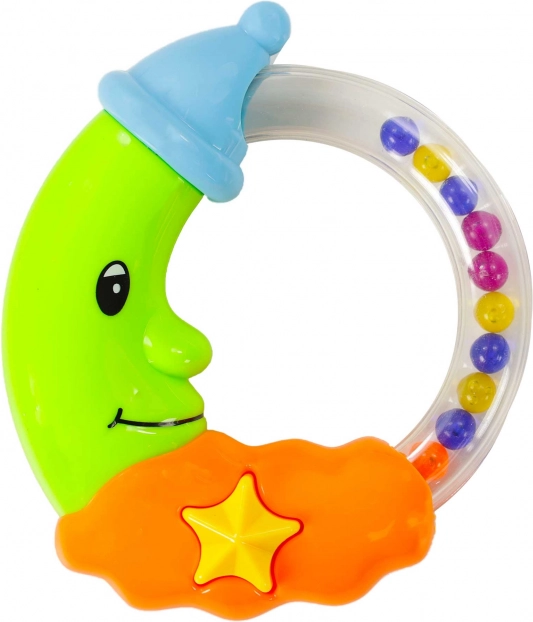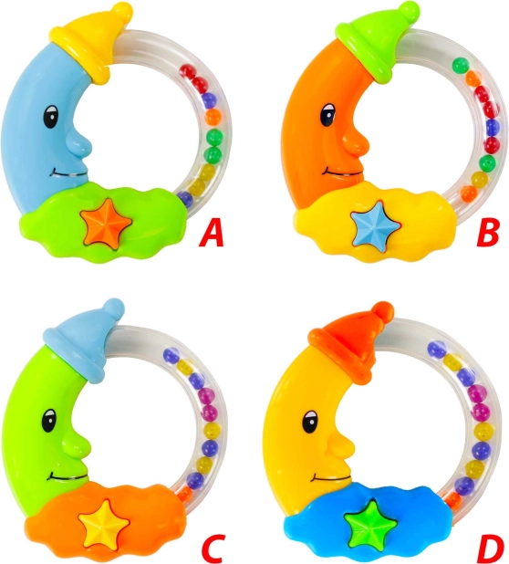 Ez a színes, mosolygós félhold alakú csörgő ideális első játék a legkisebb kezek számára. Az átlátszó gyűrűben lévő színes golyók mozgás közben kellemes hangot adnak, felkeltik a baba figyelmét és támogatják természetes kíváncsiságát. A kontrasztos színek és a kedves dizájn szórakoztatnak, miközben segítik az érzékszervek fejlődését.