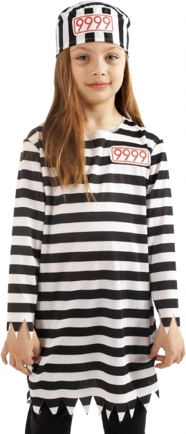 Stílusos, csíkos rabnő jelmez 6–8 éves lányoknak (117–128 cm), tökéletes farsangra, jelmezbálra és iskolai műsorokra. Tartalma: hosszú ujjú csíkos póló és sapka 9999-es számmal. A praktikus ECO csomagolás helytakarékos, környezetkímélő, és ideális online vásárláshoz.