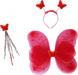 Aranyos piros pillangószárnyak gumipánttal, ideális lányoknak 3-10 éves kor között, kiegészítve pillangós fejpánttal és pálcával.