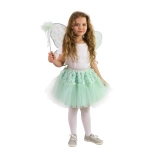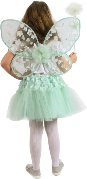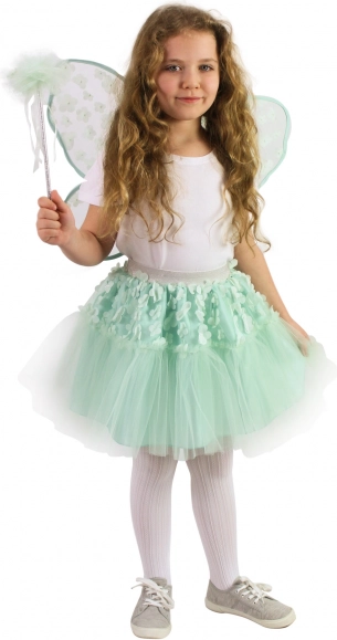 Varázsolja minden kislányt bájos tündérré ezzel a csodálatos jelmezzel. A zöld tüll szoknya szatén alsóval apró virágokkal díszítve van, derékban ezüst gumival a kényelmes viseletért. A szárnyak és a pálca tökéletesen illeszkednek az összképhez.