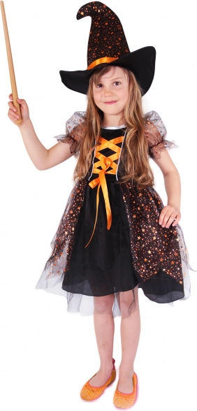 A jelmez tartalmaz egy fekete ruhát narancssárga elemekkel és szatén szalaggal díszítve, amely varázslatos megjelenést nyújt.