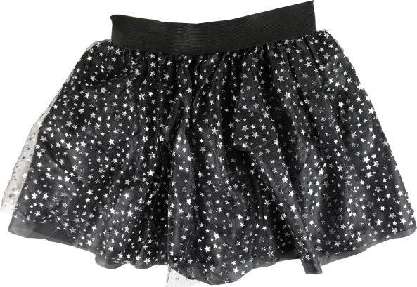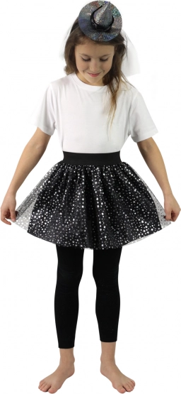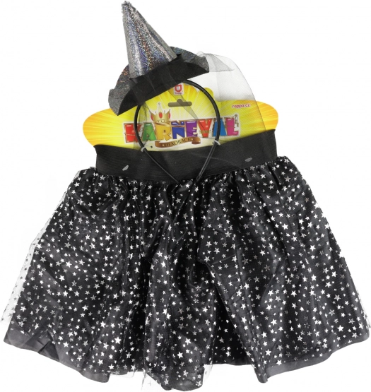 Szuper szett minden kis boszorkány divatrajongónak! A szoknya fekete alsórésszel rendelkezik, amelyet ezüst csillagmintás tüll borít. 3–7 éves kislányok számára készült. A szoknya hossza 28 cm. A szettet egy kis kalappal díszített fejpánt egészíti ki, amely tökéletesen illik a szoknyához. Remek választás Halloweenre vagy farsangra is!