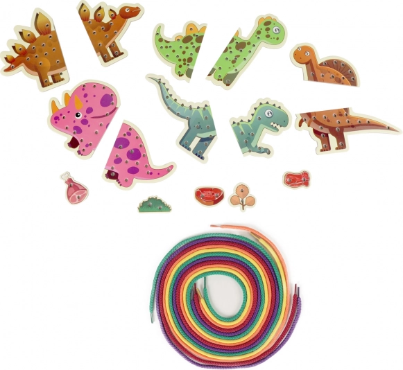 Fedezze fel a játékos dinoszauruszos fűzős szettet, amely ötvözi a tanulást és a szórakozást. A sima lyukakkal és élénk színekkel ellátott fa elemek ösztönzik a szem–kéz koordináció és a motoros készségek gyakorlását. Minden dinoszauruszon több lyuk található, így a gyerekek különféle mintákat próbálhatnak ki, és fejleszthetik fantáziájukat.