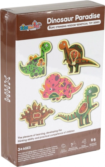 A készlet öt darab dinoszauruszt és öt strapabíró zsinórt tartalmaz, amelyek jól illenek a gyerekek kezébe. A fűzés halk, biztonságos, és utazáshoz vagy óvodába is megfelelő. A játék fejleszti a logikus gondolkodást, a kitartást és az önállóságot.