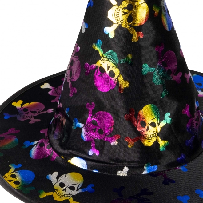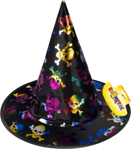 Stílusos gyermek boszorkánykalap fekete színben, színes, mágikus koponyákkal díszítve; tökéletes kiegészítő Halloweenre, farsangra és boszorkánybulira. Gyermekméret, 3+ éveseknek, a kényelmes viselethez 335 × 280 × 335 mm praktikus méretben.